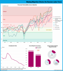 By mid-2023, all sectors had high or critical-level personnel vulnerability scores. This trend coincided with Russia’s telegraphed lightning exercises around March 2021, war-avoidant emigration, and the military buildup on the Ukrainian border leading up to the February 2022 Russian invasion of Ukraine. See the infographic below: