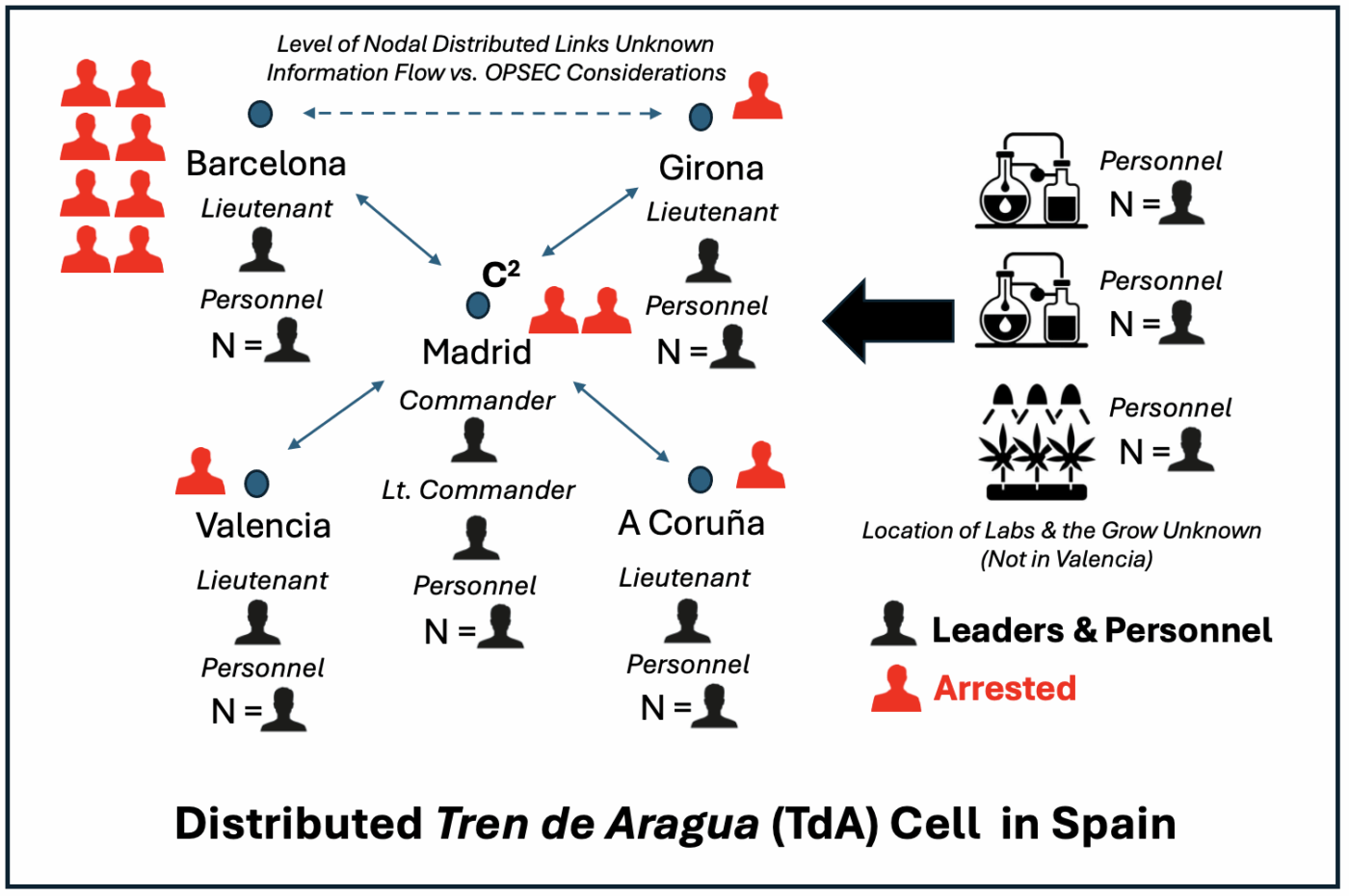 Such a semi-hybrid network of nodes (cells) would be composed of core TdA members, their associates and affiliates, as well as local criminal group (gang) member cooperative activities taking place in multiple geographic locales. If this assessment is accurate, it represents a potentially greater problem for the Spanish Policia Nacional to contend with rather than the singular TdA cell (albeit said to be distributed) that has said to have been now dismantled.