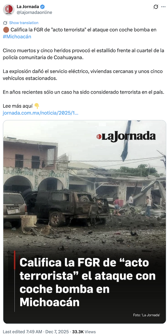 “Califica la FGR de “acto terrorista” el ataque con coche bomba en #Michoacán.” La Jornada(@lajornadoonline) on X. 7 December 2025, https://x.com/lajornadaonline/status/1997695009923944852?s=20.