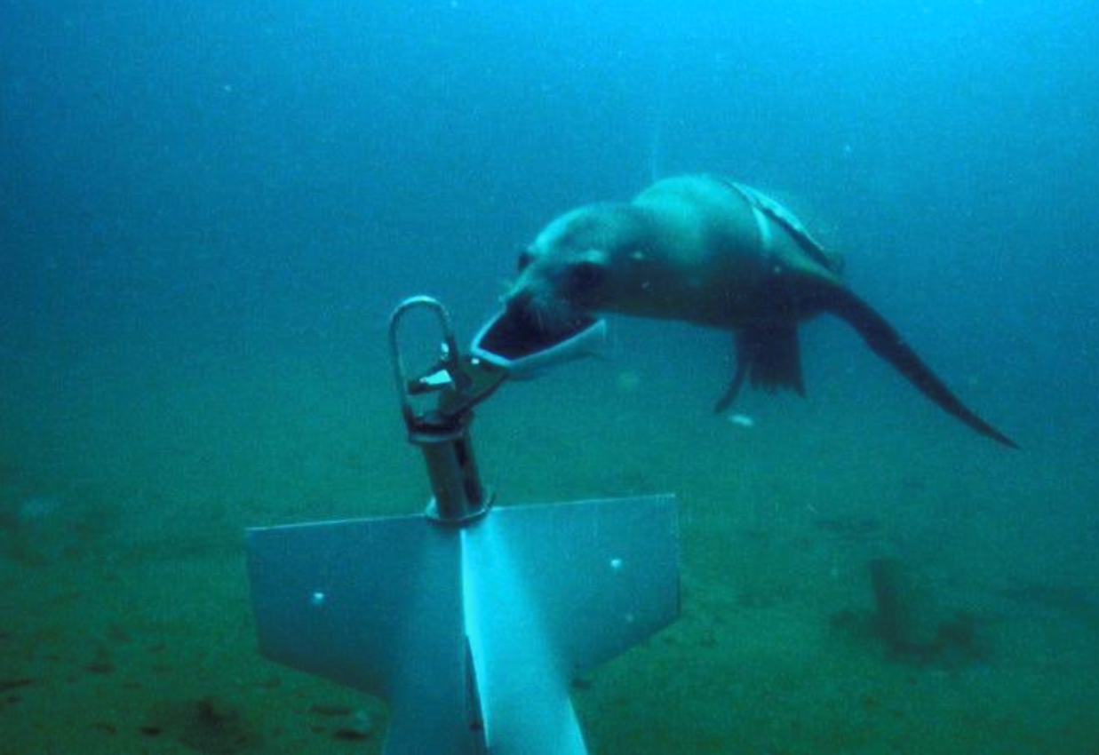 (A US Navy sea lion attaches a recovery line to a piece of test equipment. Image Credit: US Navy)