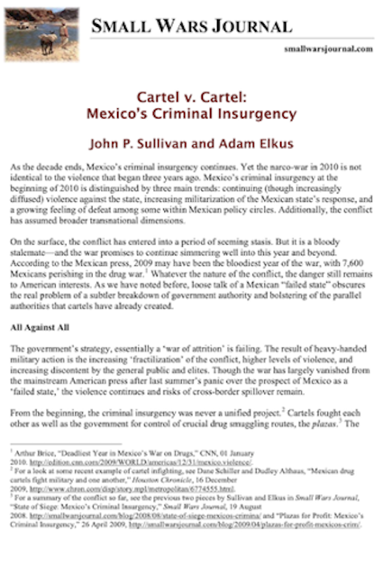 John P. Sullivan and Adam Elkus, “Cartel v. Cartel: Mexico’s Criminal Insurgency.” Small Wars Journal. 2 February 2010: pp. 1–11, https://smallwarsjournal.com/2010/02/02/cartel-v-cartel-mexicos-criminal-insurgency/(Mirrored at https://www.academia.edu/1113545/Cartel_v_Cartel_Mexicos_Criminal_Insurgency):