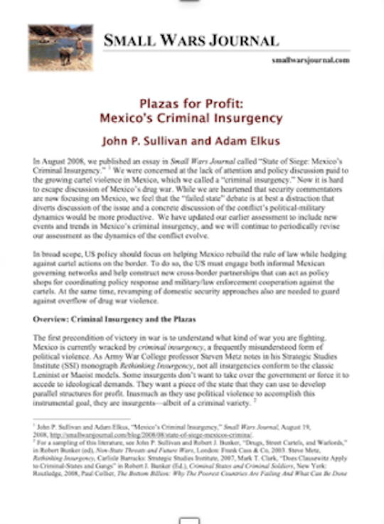 John P. Sullivan and Adam Elkus, “Plazas for Profit: Mexico’s Criminal Insurgency.” Small Wars Journal. 26 April 2009: pp. 1–9, http://smallwarsjournal.com/blog/2009/04/plazas-for-profit-mexicos-crim/ (Mirrored at: https://www.academia.edu/1113524/Plazas_for_Profit_Mexico_s_Criminal_Insurgency):