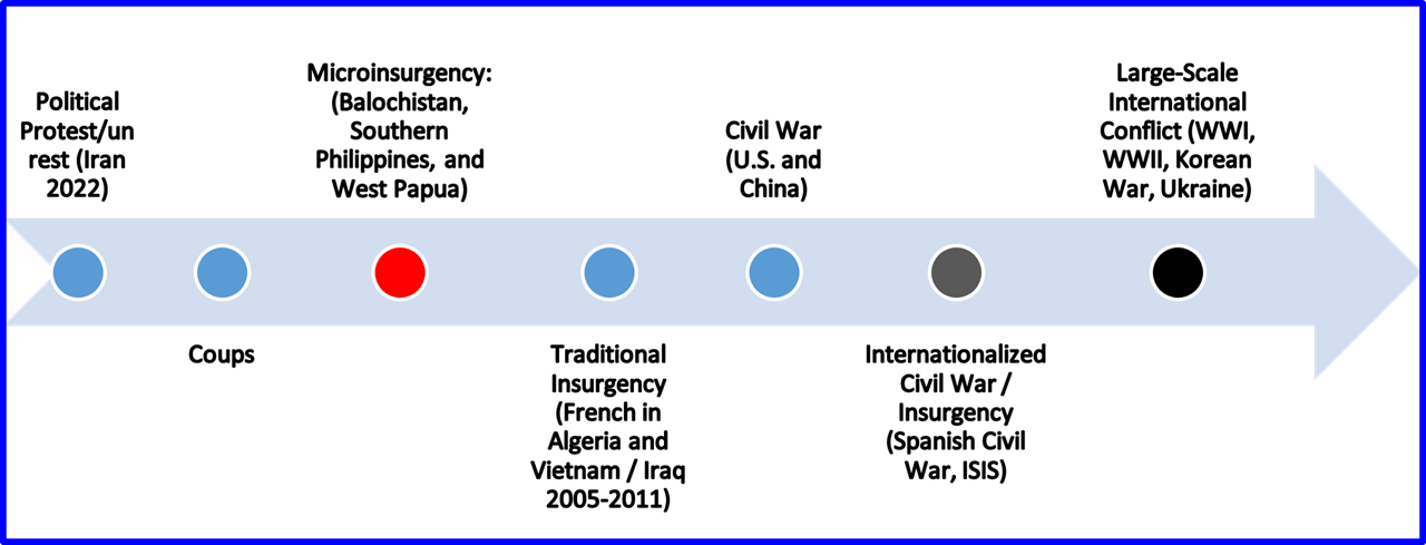 The focus of research on microinsurgencies begs the initial task to define the categories and concepts of intrastate armed conflicts. A hierarchy of all categories of armed conflict is depicted in Figure 1 below. This hierarchy is defined in terms of the size, range, participants, and magnitude of the conflict in question. Microinsurgencies are at the left or lower end of this scale. At the higher and larger end of the conflict scale are civil wars and international conflict. Examples of most are provided in Figure 1 in parentheses.