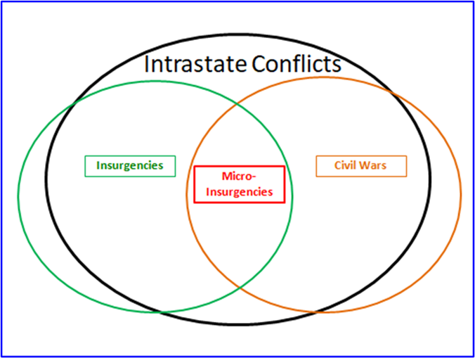 [2] This Venn Diagram displays the overlap among the three most significant intrastate conflicts: civil wars, insurgencies, and microinsurgencies. It also illustrates one of the key defining characteristics of microinsurgencies. They are always within the geographical boundaries of a single state, unlike many civil wars and larger insurrections, which often become international in scale and scope.