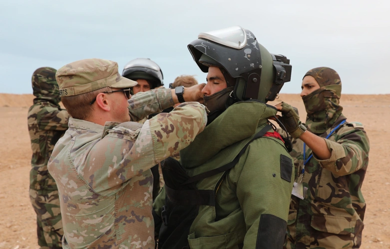 US Army EOD specialist gears up a solider with the Royal Moroccan Armed Forces in an Explosive Ordnance Disposal (EOD) 9 Bomb Suit during African Lion 2025. Photo courtesy US Army.