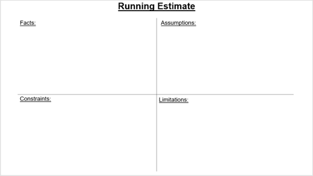 One of the reasons that staffs and individual staff members do not focus on determining clear conclusions and recommendations is that current tools do not emphasize a focus on such items. Units commonly use a running estimate format which forms quad charts listing facts, assumptions, constraints, limitations, etc. Conclusions and recommendations (seen as the results of the listed facts, assumptions, etc.) are typically listed at the end of this running estimate.