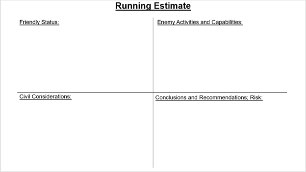 Both templates list the most important part last. This means that the most important part of the running estimate is often relegated to being an afterthought. Instead, this article proposes the use of the tools below or similar tools to refocus the running estimate on conclusions and recommendations. Additionally, the running estimate should serve as a holistic assessment of operations by phase/critical event as opposed to a simple presentation of raw data and information.