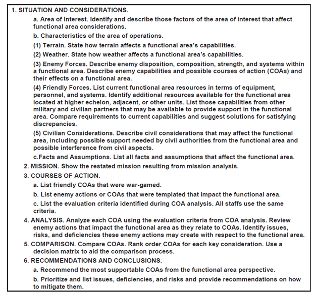 Having provided an updated focus and conceptual framework for running estimates, the following list of considerations will provide more specific items which need to be in an individual staff section’s running estimate as they create their conclusions and recommendations. While not an exhaustive list, these items provide a starting point from which to build a running estimate and start the background analysis required to give cogent conclusions and recommendations to a commander and keep the entire staff informed.