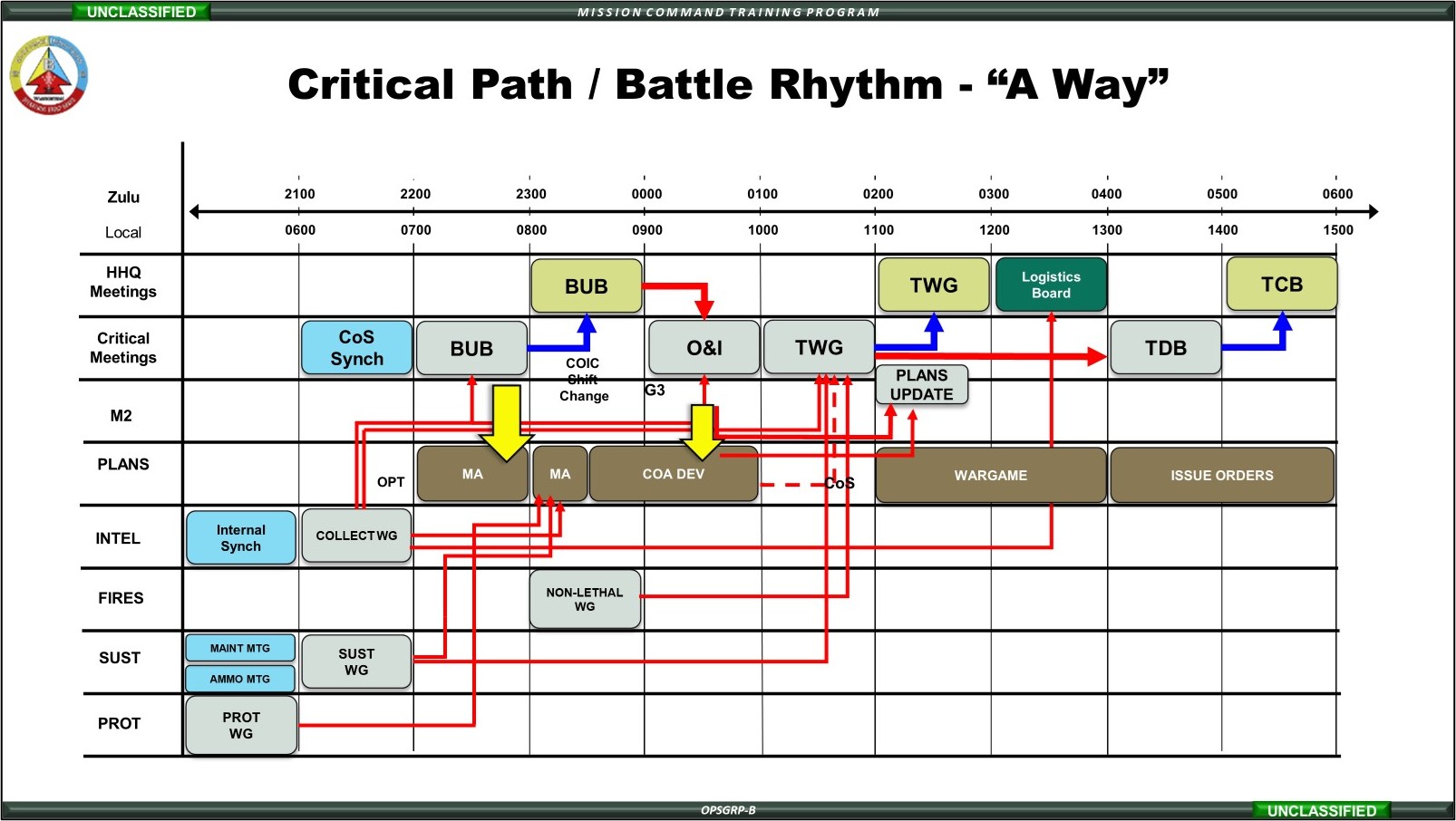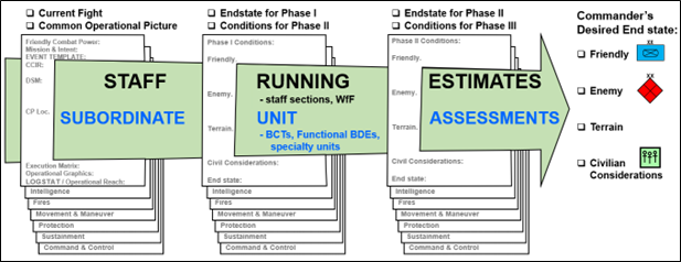 This structure is too inflexible for large-scale combat as running estimates are only updated once or twice daily in support of follow-on meetings. Continuously updated running estimates presenting clear conclusions and recommendations will allow commanders and staffs to identify opportunities to exploit around the clock.