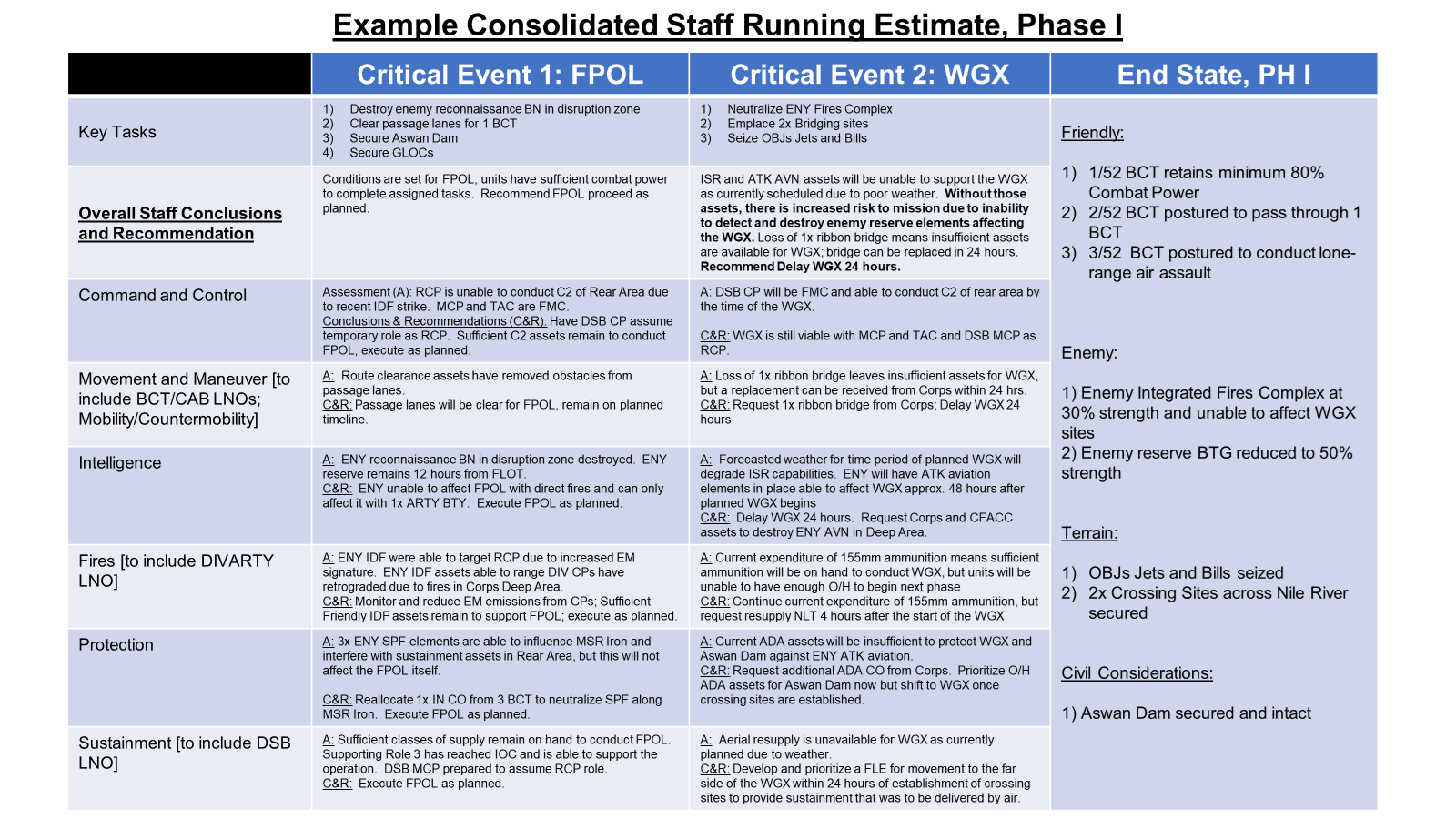 This template, which can be used for both the common operational picture (COP) and in staff meetings, helps solve several problems with current running estimate formats and briefing products. It presents assessments, conclusions, and recommendations that drive decisions first. It forces staff sections, to include subordinate unit liaison officer (LNOs), to look closely at specific requirements for critical events and phases and their inputs to the feasibility of actions during those phases/events. This helps focus the running estimate and prevents running estimates from becoming compilations of unrelated facts. It also forces staffs to anticipate future requirements and assess progress towards them as opposed to maintaining a myopic focus on current operations. Finally, and perhaps most importantly, this running estimate tool ties the current state to the planned end state and assesses progress toward the end state.