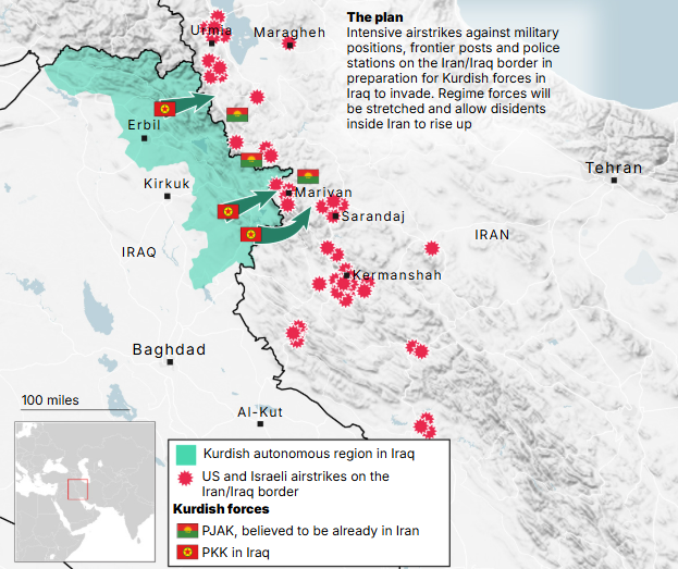 The UK’s Daily Mail also reports that these developments may be tied to a broader U.S. and Israeli effort to open a new front against Iran by leveraging Kurdish opposition groups operating along the Iran-Iraq frontier. Airstrikes on Iranian military and security installations in western Iran appear to be aimed at weakening border defenses and creating access points for Kurdish fighters to cross into the country.