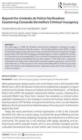 Claudio Cruz and David H. Ucko, “Beyond the Unidades de Polícia Pacificadora: Countering Comando Vermelho’s Criminal Insurgency.” Small Wars & Insurgencies. Vol. 29, no. 1. 22 December 2017: pp. 38–67, https://doi.org/10.1080/09592318.2018.1404772: