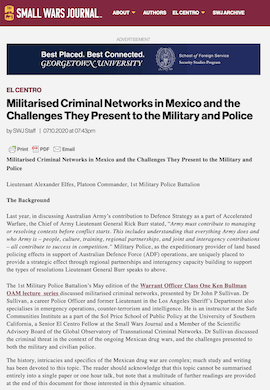 Lieutenant Alexander Elfes, “Militarised Criminal Networks in Mexico and the Challenges They Present to the Military and Police.” Small Wars Journal. 10 July 2020: pp. 1–5, https://smallwarsjournal.com/2020/07/10/militarised-criminal-networks-mexico-and-challenges-they-present-military-and-police/: