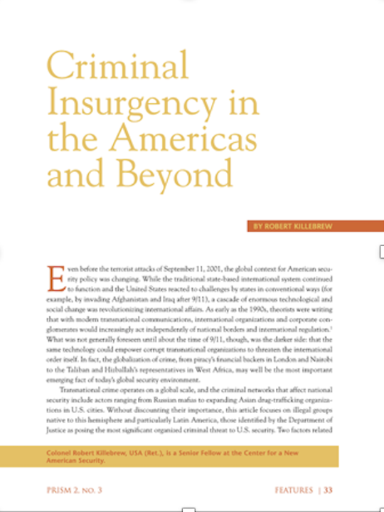 Robert Killebrew, “Criminal Insurgency in the Americas and Beyond.” Prism. Vol. 2, No. 3. June 2011: pp. 33≠52, https://ciaotest.cc.columbia.edu/journals/prism%20/v2i3/f_0024141_19688.pdf: