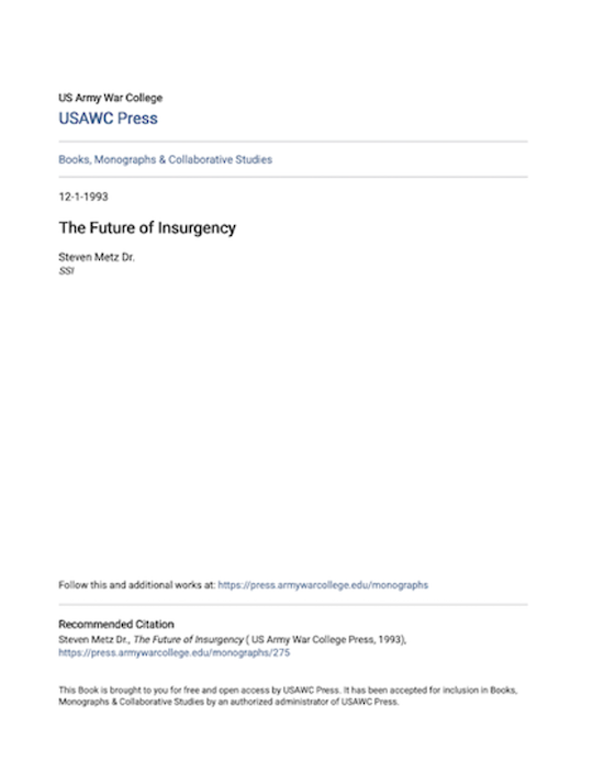 Steven Metz, The Future of Insurgency. Carlisle Barracks: United States Army War College. 1 December 1993: pp. 1–30, https://press.armywarcollege.edu/cgi/viewcontent.cgi?article=1274&context=monographs: