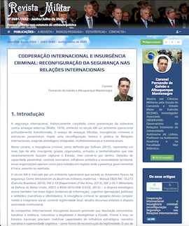 Colonel Fernando de Galvão e Albuquerque Montenegro, “Cooperação Internacional e Insurgência Criminal: Reconfiguração da Segurança nas Relações Internacionais” (International Cooperation and Criminal Insurgency: Reshaping Security in International Relations). Revista Militar. No. 2681/2682. June/July 2025: pp. 1–7, https://www.revistamilitar.pt/artigo/1886: