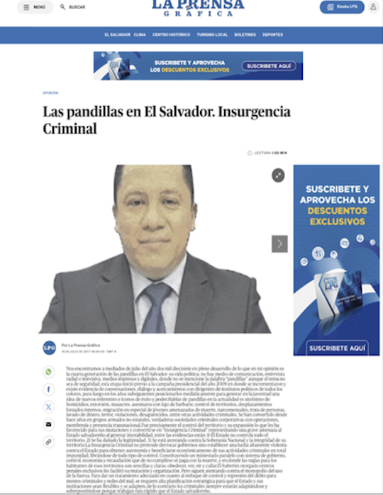 “Las pandillas en El Salvador. Insurgencia Criminal” (Gangs in El Salvador. Criminal Insurgency). La Prensa Gráfica. 15 July 2017: pp. 1–2, https://www.laprensagrafica.com/opinion/Las-pandillas-en-El-Salvador.-Insurgencia-Criminal-20170715-0066.html: