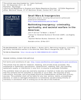 John P. Sullivan and Robert J. Bunker, “Rethinking Insurgency: Criminality, Spirituality, and Societal Warfare in the Americas.” Small Wars & Insurgencies. Vol. 22, no. 5. 29 November 2011: pp. 742–763, https://www.tandfonline.com/doi/abs/10.1080/09592318.2011.625720: