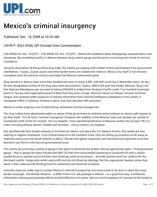 John P. Sullivan, “Outside View: Mexico’s criminal insurgency.” UPI. 18 December 2008, https://www.upi.com/Top_News/Special/2008/12/18/Outside-View-Mexicos-criminal-insurgency/34061229613633/: