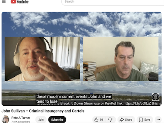 Pete A. Turner, “John P. Sullivan – Criminal Insurgency and Cartels.” Break it Down Show (YouTube). 19 March 2024: 1:08:42 Hour Video, https://www.youtube.com/watch?v=avOjyBv7Cr8: