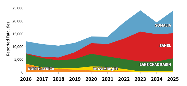 Three theaters—the Sahel, Somalia, and the Lake Chad Basin—collectively account for 98 percent of all militant Islamist-linked fatalities on the continent, as the fatalities chart below illustrates. The Sahel alone accounts for 41 percent of total deaths, a position it has held for five consecutive years, while Somalia registered the most dramatic single-year surge with fatalities nearly doubling, and the Lake Chad Basin reversed a five-year downward trend with a 28 percent increase.
