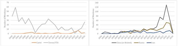 Over the past decade, SOUTHCOM has increasingly viewed the rise of Chinese influence in Latin America as the primary challenge in the Western Hemisphere. While the 2026 posture statement continues to address China’s role in the region, its prominence is notably diminished in favor of a greater focus on the role of cartels and foreign terrorist organizations (FTOs)—in part due to the Trump administration’s designation of the cartels as FTOs in 2025. This shift from great power competition and the view of China as a pacing challenge in the region toward viewing criminal organizations as a greater threat in the region echoes other voices in the administration and a new approach in handling crime as a threat through the use of force (Figures 2 & 3).